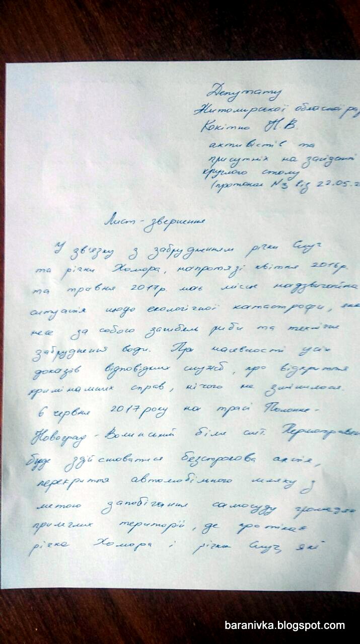 "У зв'язку з забрудненням річки Случ та річки Хомора протягом квітня 2016 року та травня 2017 року має місце надзвичайна ситуація щодо екологічної катастрофи, яка тягне за собою загибель риби та технічне забруднення води. При наявності усіх доказів відповідних служб, про відкриття кримінальних справ, нічого не змінилося.